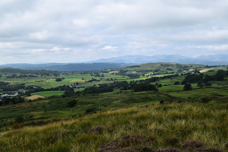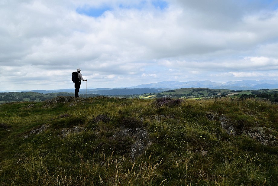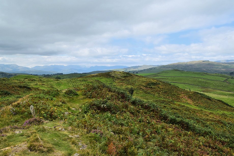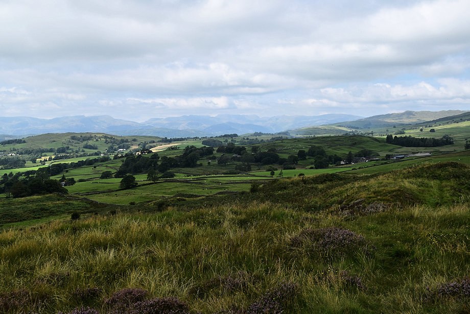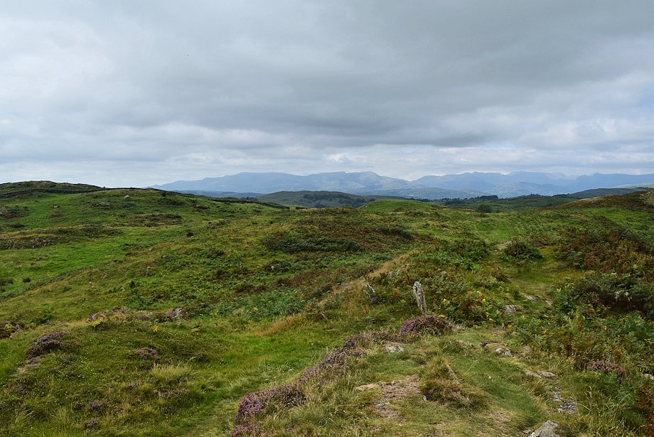 | Looking west northwest to a hazy outline of fells which include, amongst others, Crinkle Crags, Bowfell, the Scafells, the Langdale Pikes and High Raise |