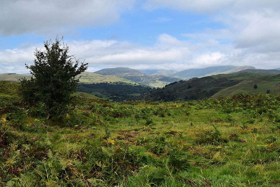 | Looking north-west, Wansfell Pike, Sour Howes, Red Screes, Sallows, Yoke and Ill Bell form the horizon |