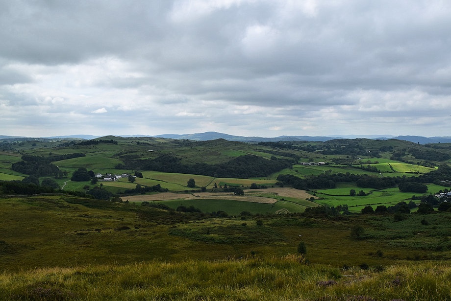 | Looking west northwest to a hazy outline of fells which include, amongst others, Crinkle Crags, Bowfell, the Scafells, the Langdale Pikes and High Raise |