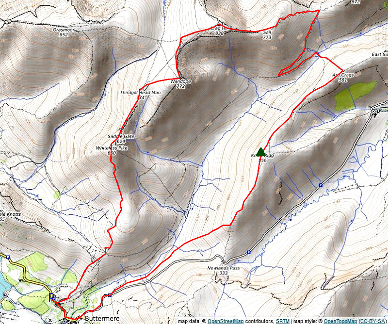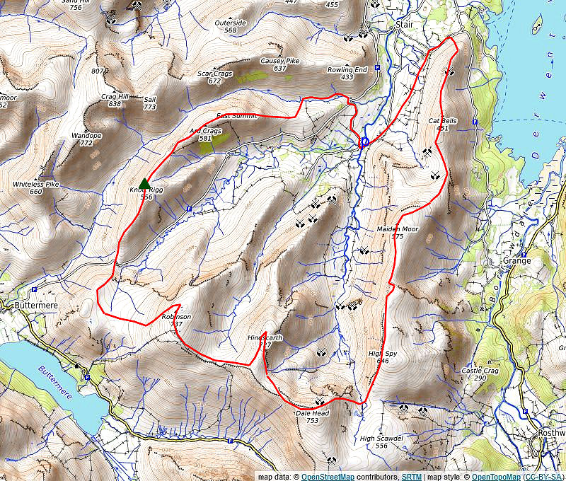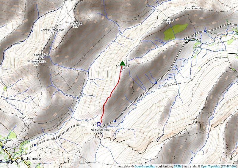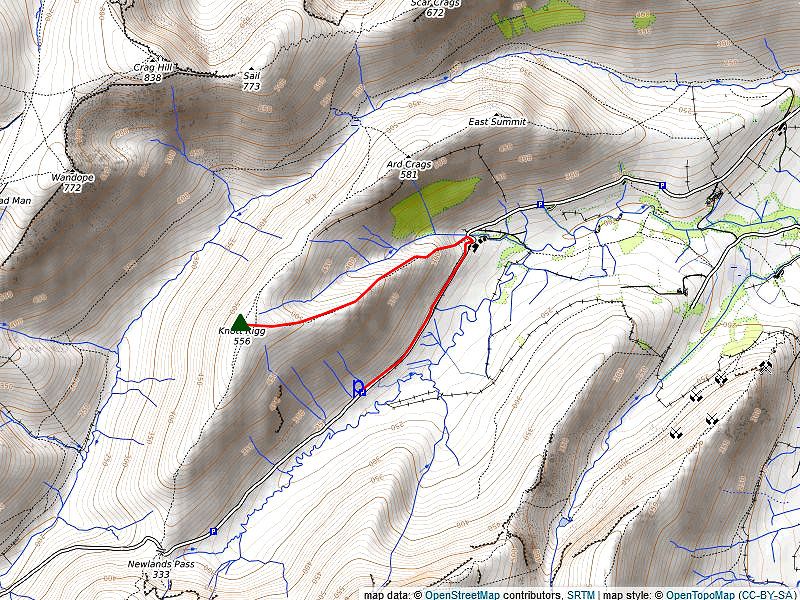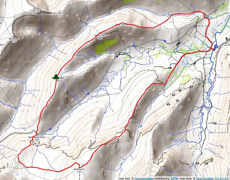 Follow the narrow ridge towards Ard Crags' East Top which provides a fine viewpoint of the fells climbed on this circuit of the Newlands Valley. All that remains is the steep descent over Aikin Knott, as the ridge broadens below Aikin Knott trend half left onto a diagonal path through the bracken to stride over Rigg Beck. Follow the path on the opposite bank back to the road near Rigg Beck Bridge, and return along the lane opposite the bridge to the car park at Chapel Bridge