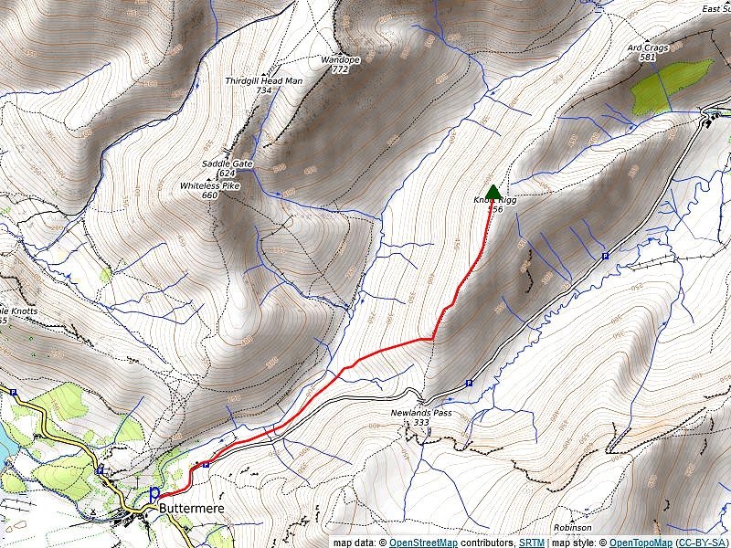 A short fingerpost points the way to Ard Crags from the parking area on Newlands Hause. A broad green path sweeps up to a line of rocky outcrops on the skyline from where the summit of Knott Rigg comes into view across a slightly marshy depression. Continue on from the small cairn on Knott Rigg, passing over the subsidiary top of Ill Crag. From the depression beyond Ill Crag an attractive heather-clad ridge leads up to the summit of Ard Crags.