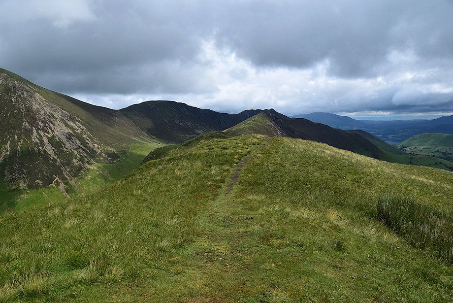 The path leads on above the edge of the steep slopes falling down to Newlands Beck on the right to rejoin the main path as it passes along Narrow Moor without gaining much height. As it begins to rise more steeply it's well worthwhile to make a short diversion to visit the cairn on Blea Crag on the left for its magnificent view of Derwent Water. Rejoin the main path as it contnues along the escarpment of Eel Crag climbing genty to the tall cairn on the summit of High Spy.